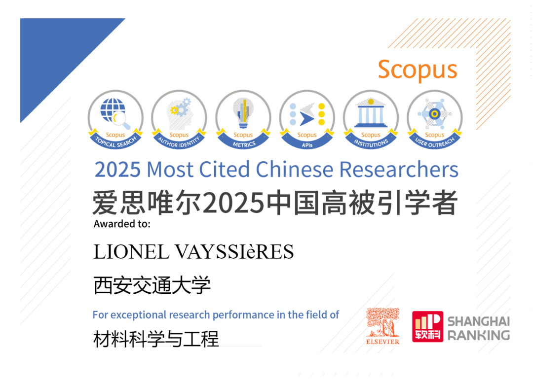 Renewable Energy (IRCRE). Most Cited Chinese Researchers 2016 in Xi’an Jiaotong University: Vice-Premier Ma Kai delivers one of the 2016 National Chinese Government Friendship Award to Xi'an Jiaotong University professor, Dr. Lionel Vayssieres.