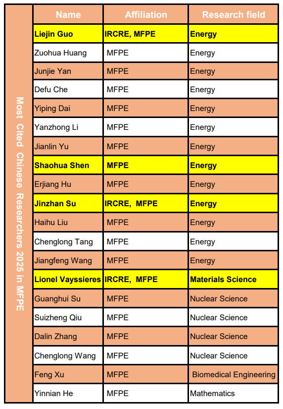 The list of Most Cited Chinese Researchers 2025 was published by Elsevier on January 30, 2026. 6310 researchers from 10 different research fields were selected and 92 professors from Xi’an Jiaotong University including 20 professors from State Key Laboratory of Multiphase Flow in Power Engineering (MFPE).